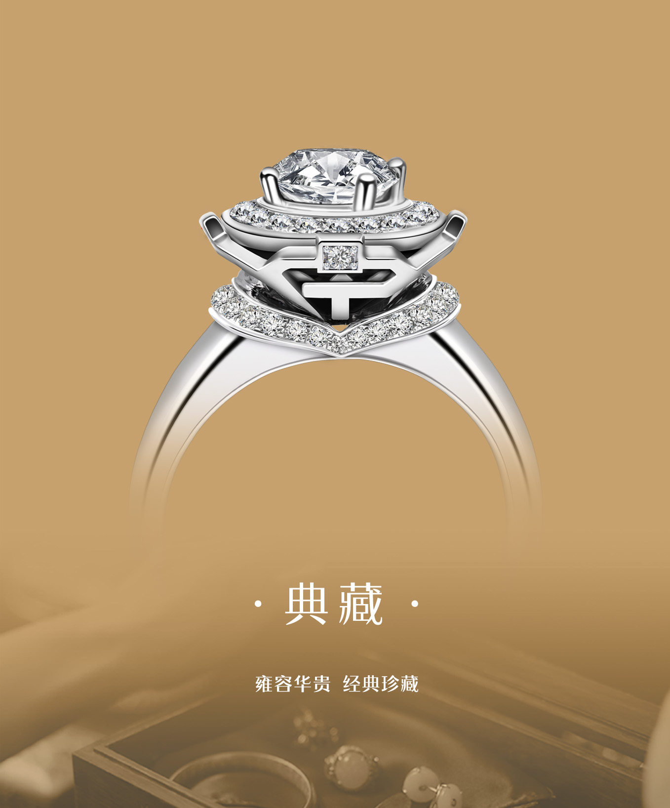 时尚与经典的设计,巧妙的构思将硬朗与圆润自然地融为一体,克拉主钻闪耀其中,豪镶白钻点缀衬托,