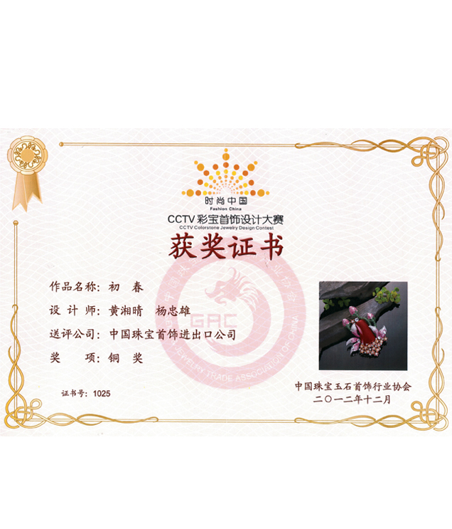 文学珠宝系列产品之“初春”荣获“时尚中国——2012 CCTV 彩宝首饰设计大赛”铜奖。