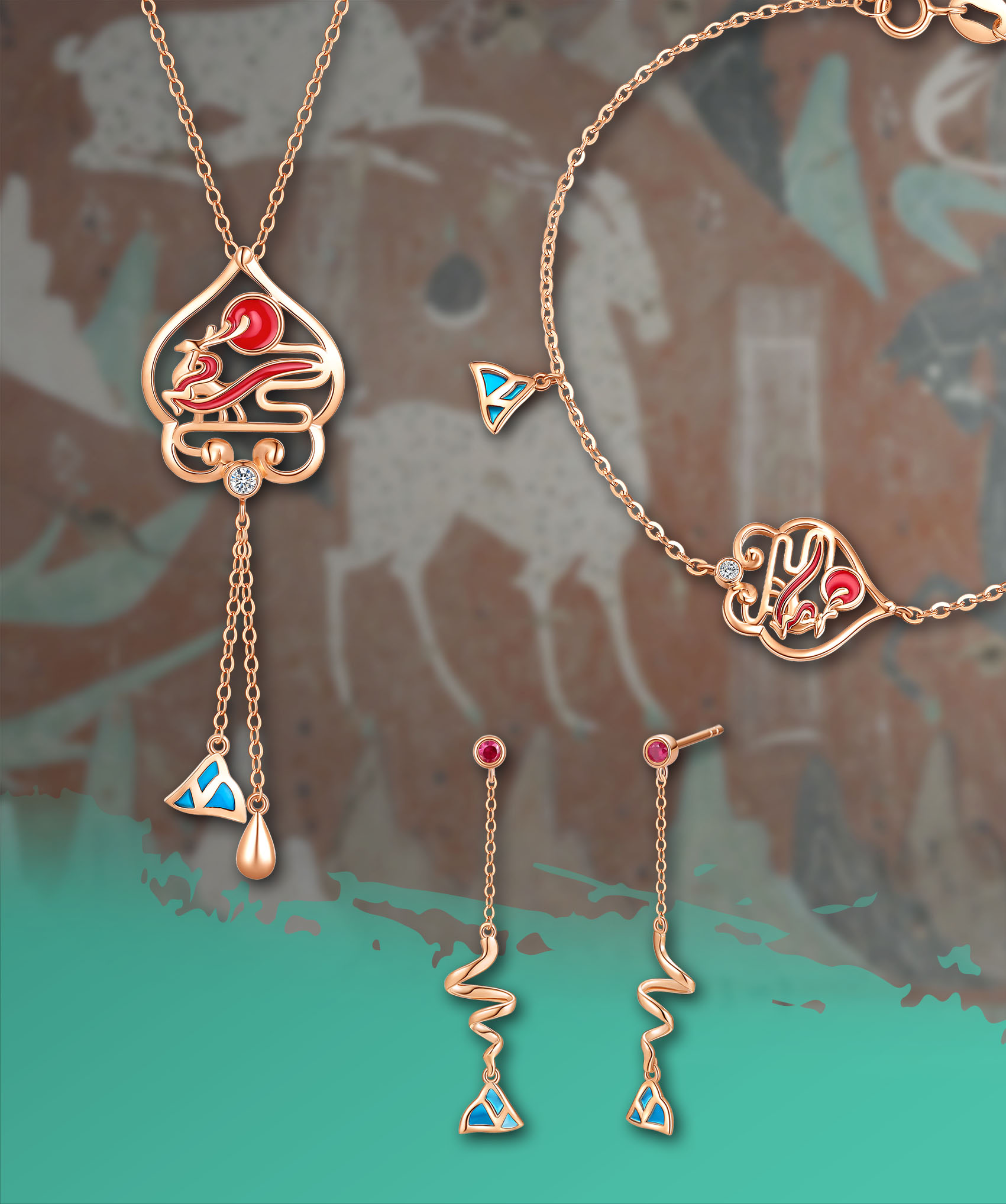 九色鹿系列。敦煌文化中的鹿造型挺拔矫健,昂首挺胸的姿态充满动感和流动性,很有王者风范,在中国的传统文化中鹿一直是善良、美好、友爱、吉祥的象征,是敦煌艺术孕育下经久不衰的经典祥瑞符号,具有东方的审美韵味和文化内涵。九色鹿象征正义、善良,鹿与“禄”谐音,寓意福禄亨通,也传递出中国传统文化中与人为善的处事之道及惩恶扬善的价值理念。九色鹿奔腾的身姿定格在首饰上,金色流光浮现,几抹色彩成为点睛之笔,成为一幅空灵画卷。