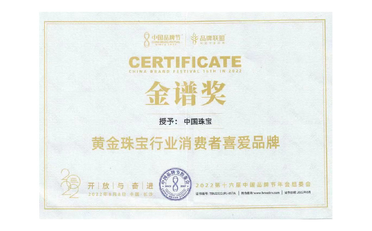 喜讯 中国珠宝获评“金谱奖.黄金珠宝行业消费者喜爱品牌”