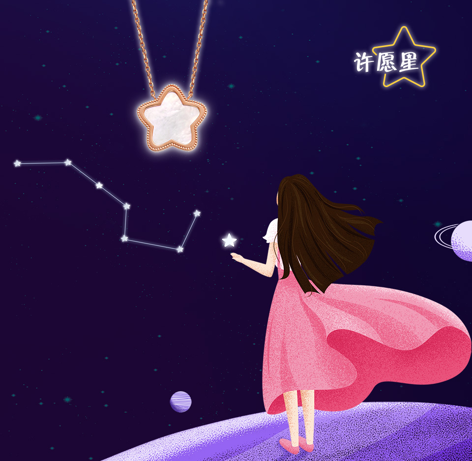 许愿星系列,以代表亮光与方向、具愿望之象征的星星为经典图形,结合丝绸光泽的18k金,与光华璀璨的宝石共同打造优雅、精致且蕴含正能量之符号珠宝精品。珍视每个人的愿望,鼓励其追求与实现,是“中国珠宝”品牌创作“许愿星”系列的初衷和动力,愿每个人的愿望都被予以珍视,愿每个人的愿望都能勇敢实现。