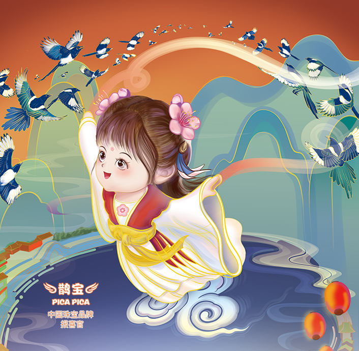 2021 年,中国珠宝重塑品牌经典「一线牵」婚庆系列钻石首饰,演绎中国传统文化与当代时尚的创新融合;推出虚拟 IP 形象「鹊宝」,将中国文化经典形象以二次元形式再塑造,并以创意跨次元直播的方式,开拓文化破圈新思路。