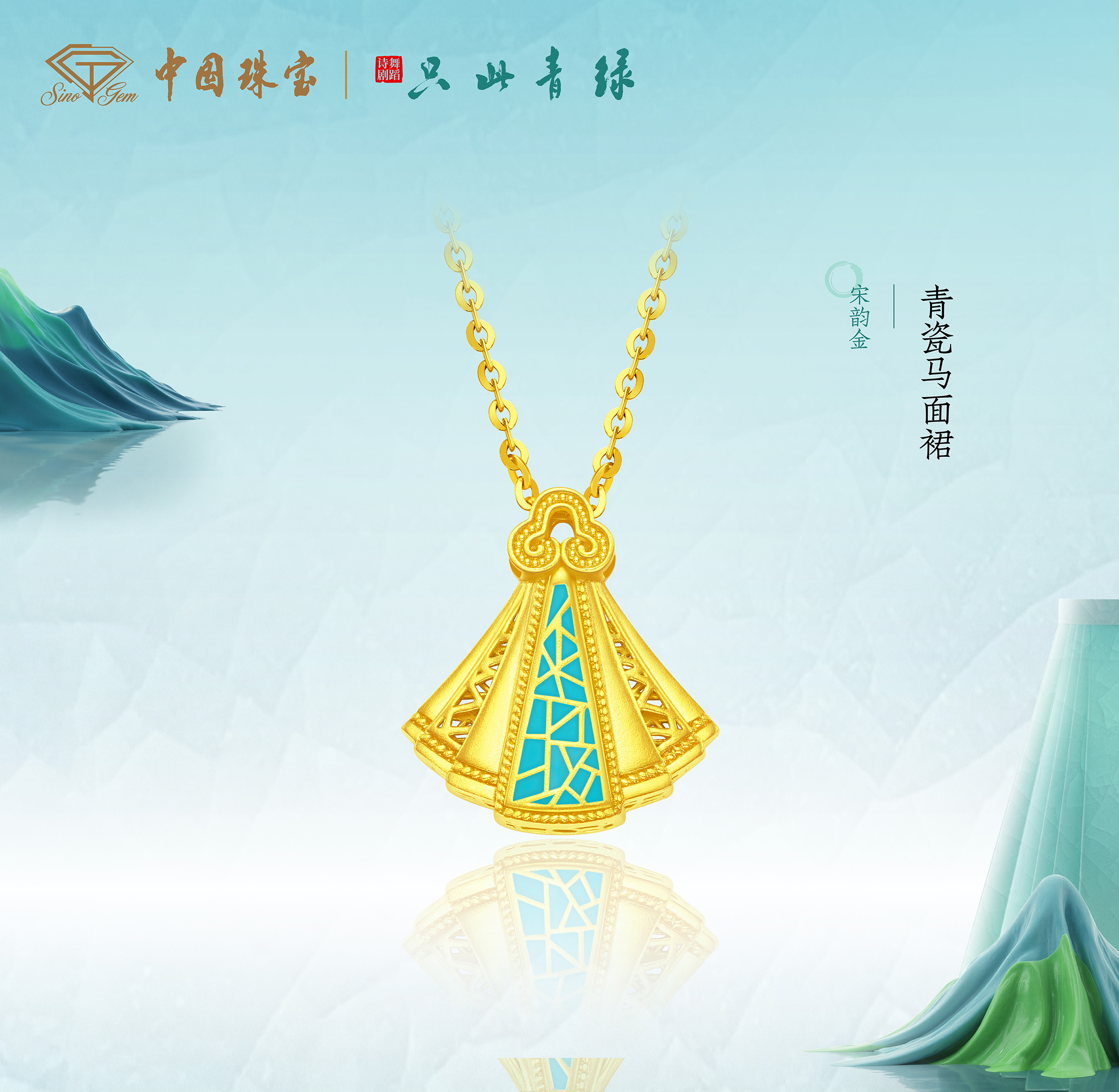 只此青绿·宋韵金系列以《只此青绿》舞蹈诗剧为源,选取汝窑色天青、粉青,精选冰裂纹、宋锦、宋花等辅助元素,将璀璨的宋代美学风格与精湛的现代金饰工艺结合,以典雅气韵,装点新中式穿搭体验,诠释了东方文化中的知性阔达与含蓄睿智之美,彰显中华美学之意蕴。本季青绿·宋韵金系列产品设计选取宋代汝瓷中最被广泛使用的天青色与宋代女性妆面浅朱微红之色为主色系,并精选宋代文化中具有鲜明特点的宋瓷、四合如意、马面裙和繁花作为核心设计元素进行创意融合,通过古法、5G、CNC、珐琅等先进工艺打造,不炫不燥,意蕴深远,彰显东方女性独有的知性阔达,以东方审美“语言”诠释现代时尚金饰之美。