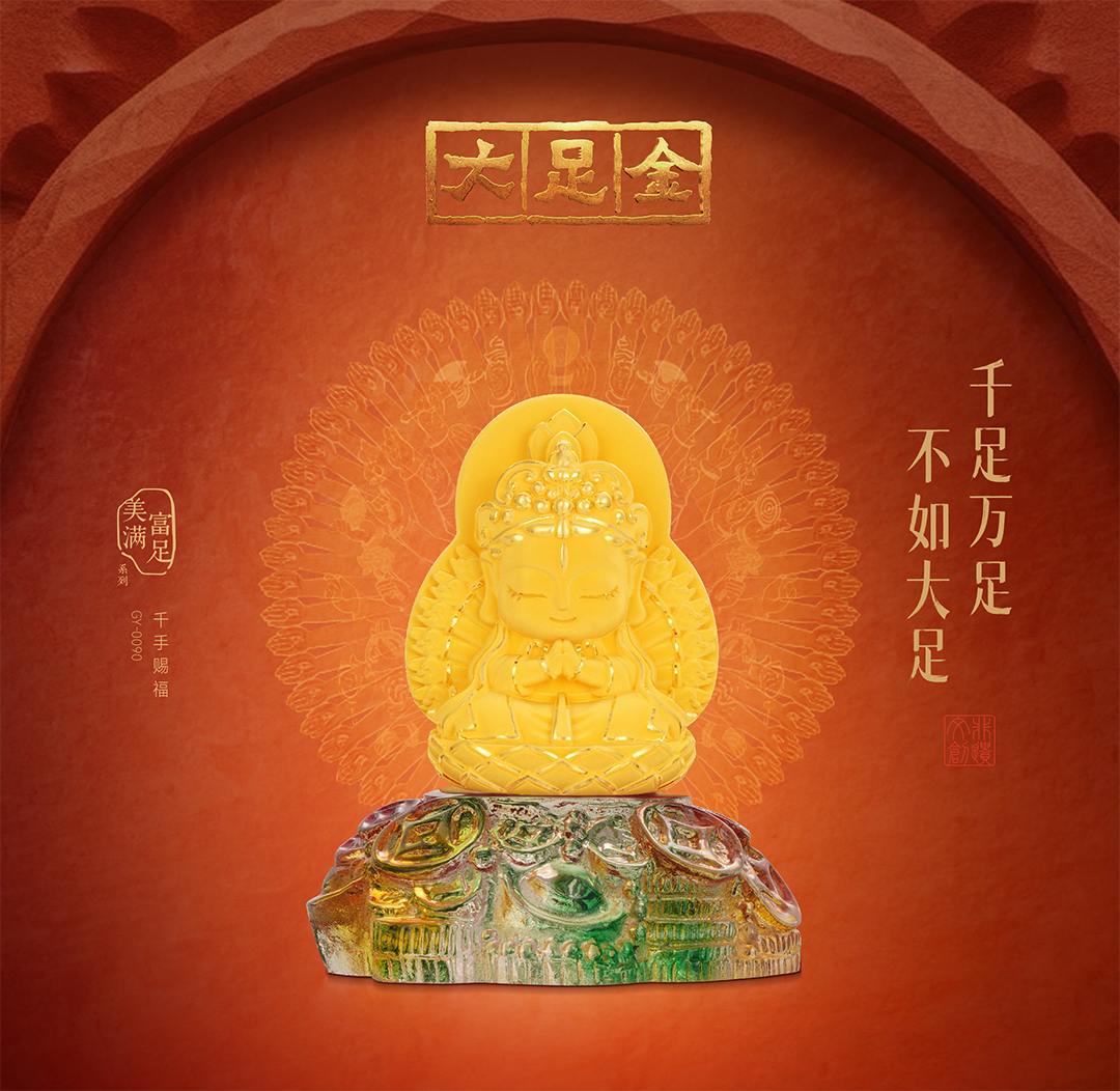 提炼世界文化遗产千年大足石刻元素,潮流演绎世界非遗大足文化倾情推出的大足金非遗时尚文创金饰系列,具有强烈大足石刻非遗文化基因带有护佑祈福概念,拥有美好文化价值内涵,具备时尚装饰性的文创金饰。