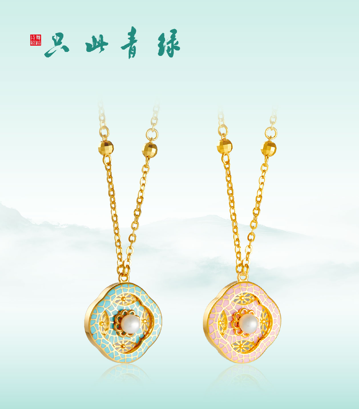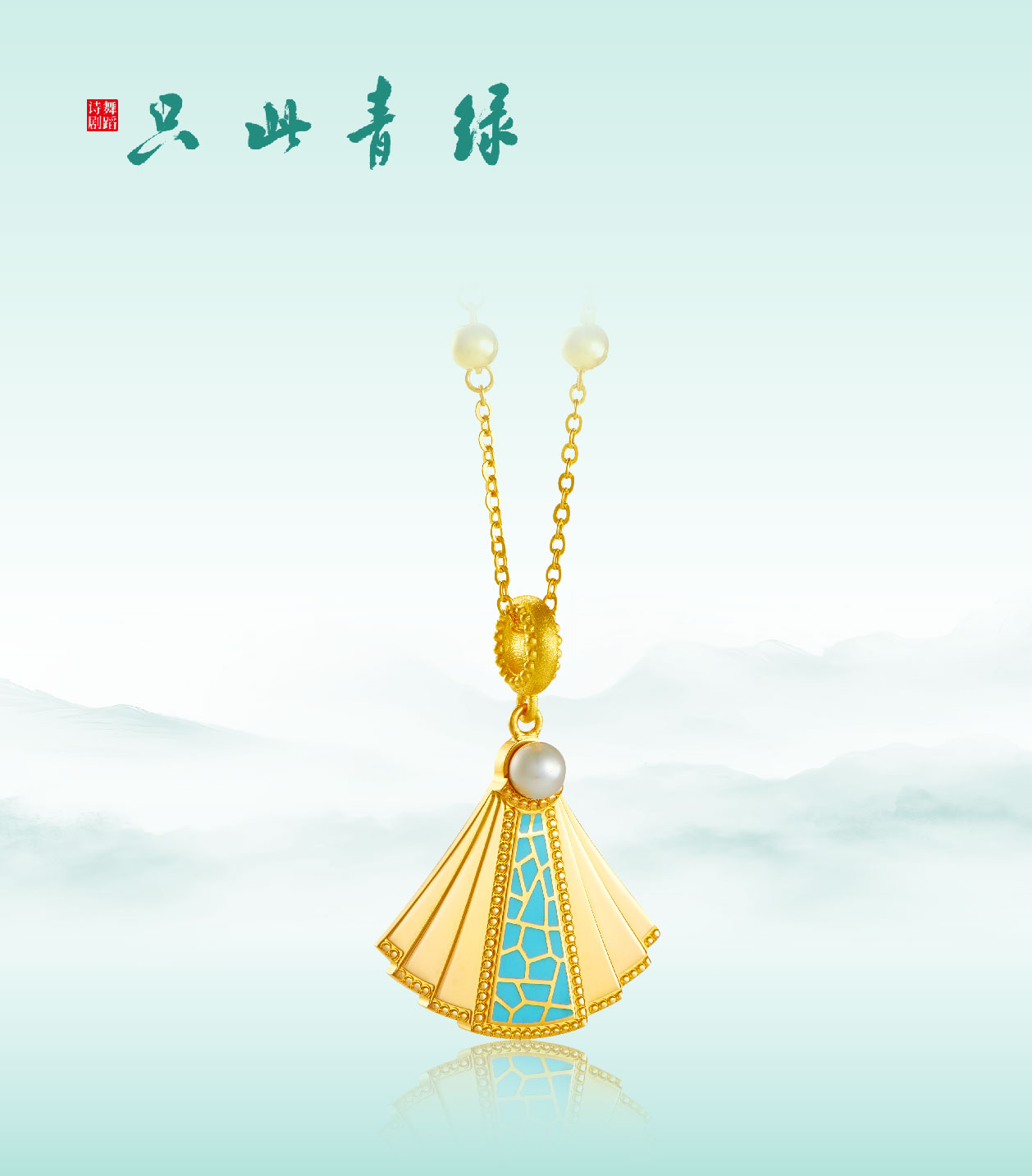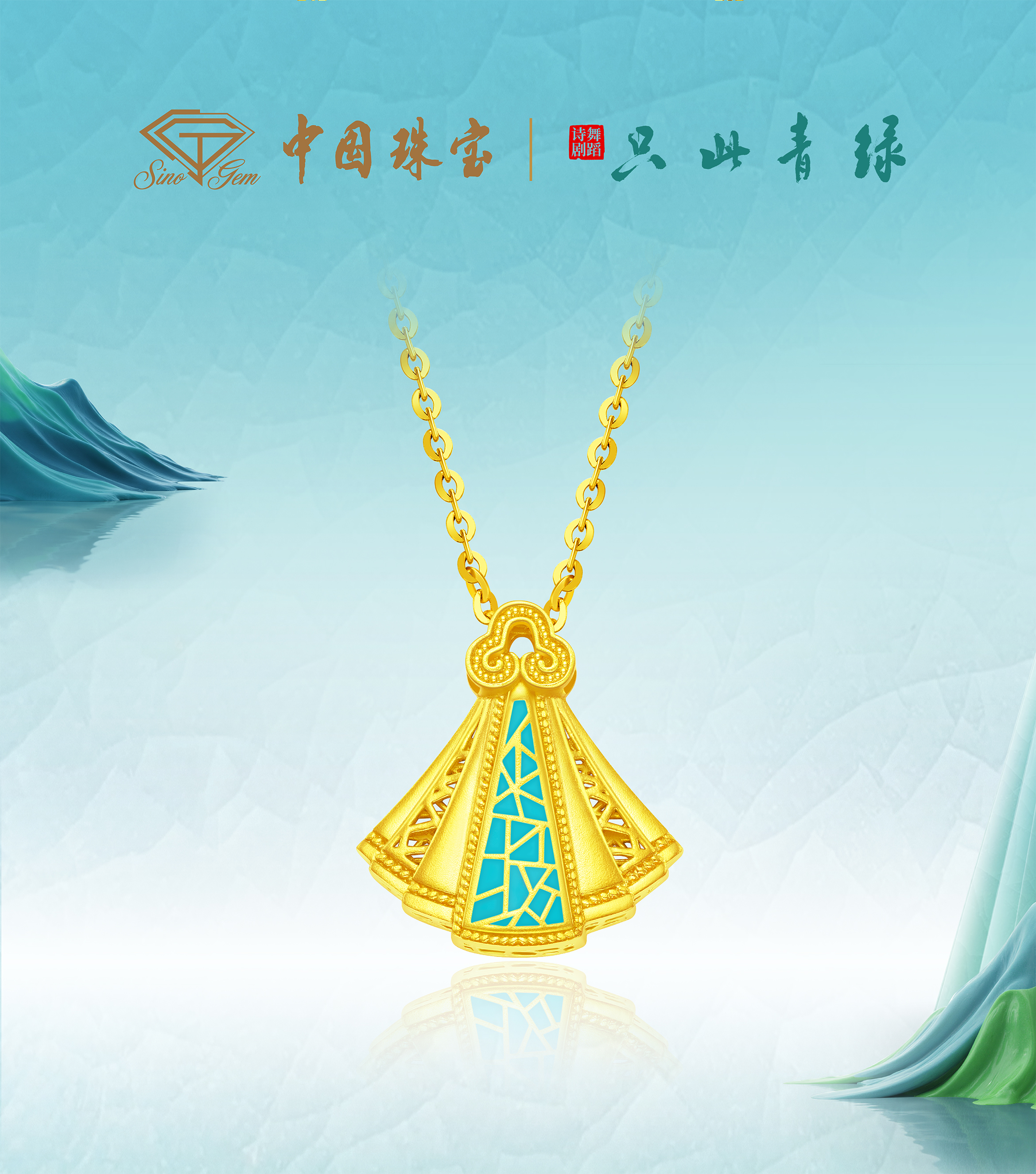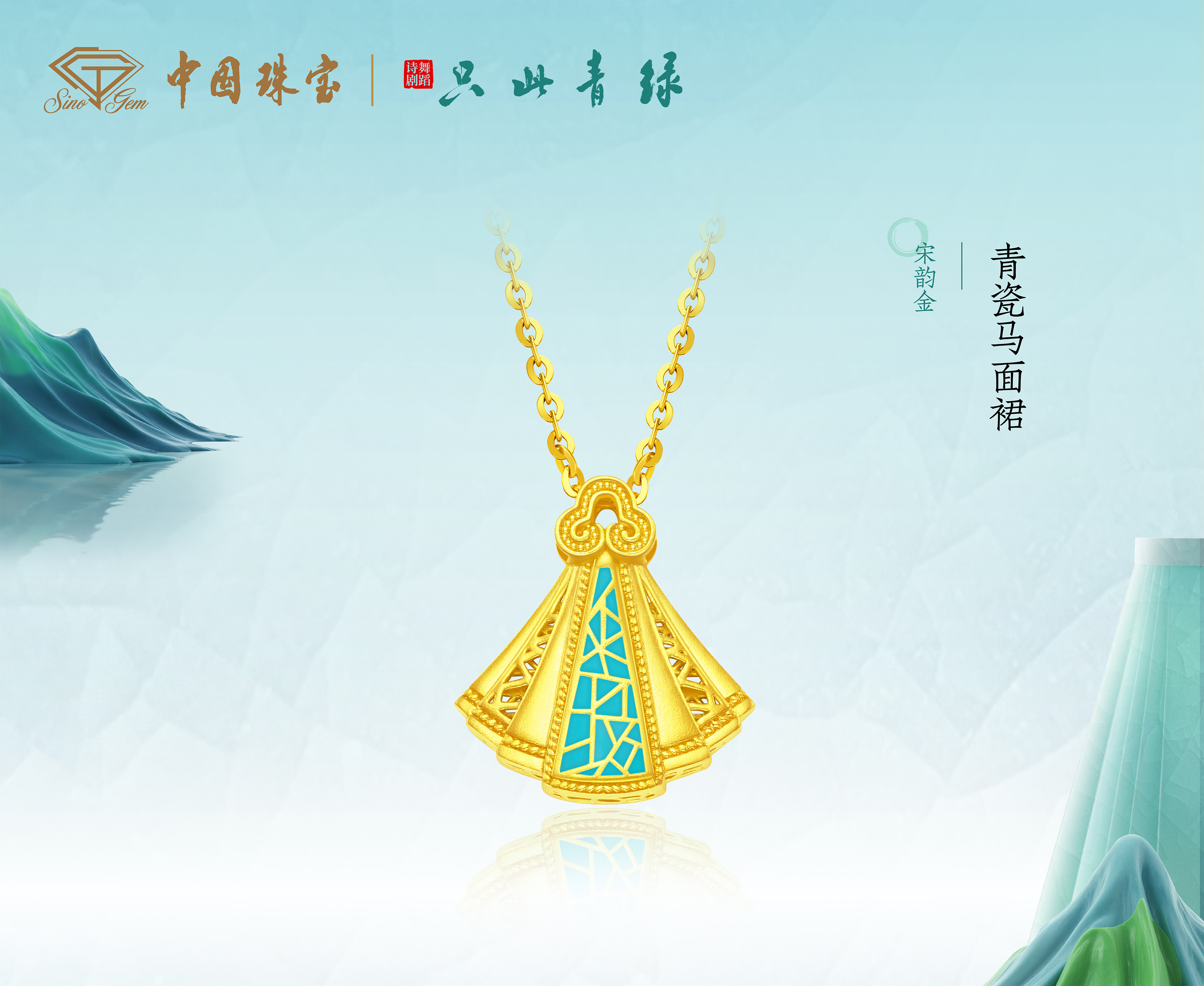只此青绿·宋韵金系列以《只此青绿》舞蹈诗剧为源,选取汝窑色天青、粉青,精选冰裂纹、宋锦、宋花等辅助元素,将璀璨的宋代美学风格与精湛的现代金饰工艺结合,以典雅气韵,装点新中式穿搭体验,诠释了东方文化中的知性阔达与含蓄睿智之美,彰显中华美学之意蕴。本季青绿·宋韵金系列产品设计选取宋代汝瓷中最被广泛使用的天青色与宋代女性妆面浅朱微红之色为主色系,并精选宋代文化中具有鲜明特点的宋瓷、四合如意、马面裙和繁花作为核心设计元素进行创意融合,通过古法、5G、CNC、珐琅等先进工艺打造,不炫不燥,意蕴深远,彰显东方女性独有的知性阔达,以东方审美“语言”诠释现代时尚金饰之美。