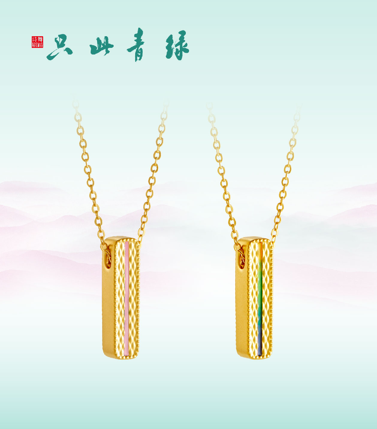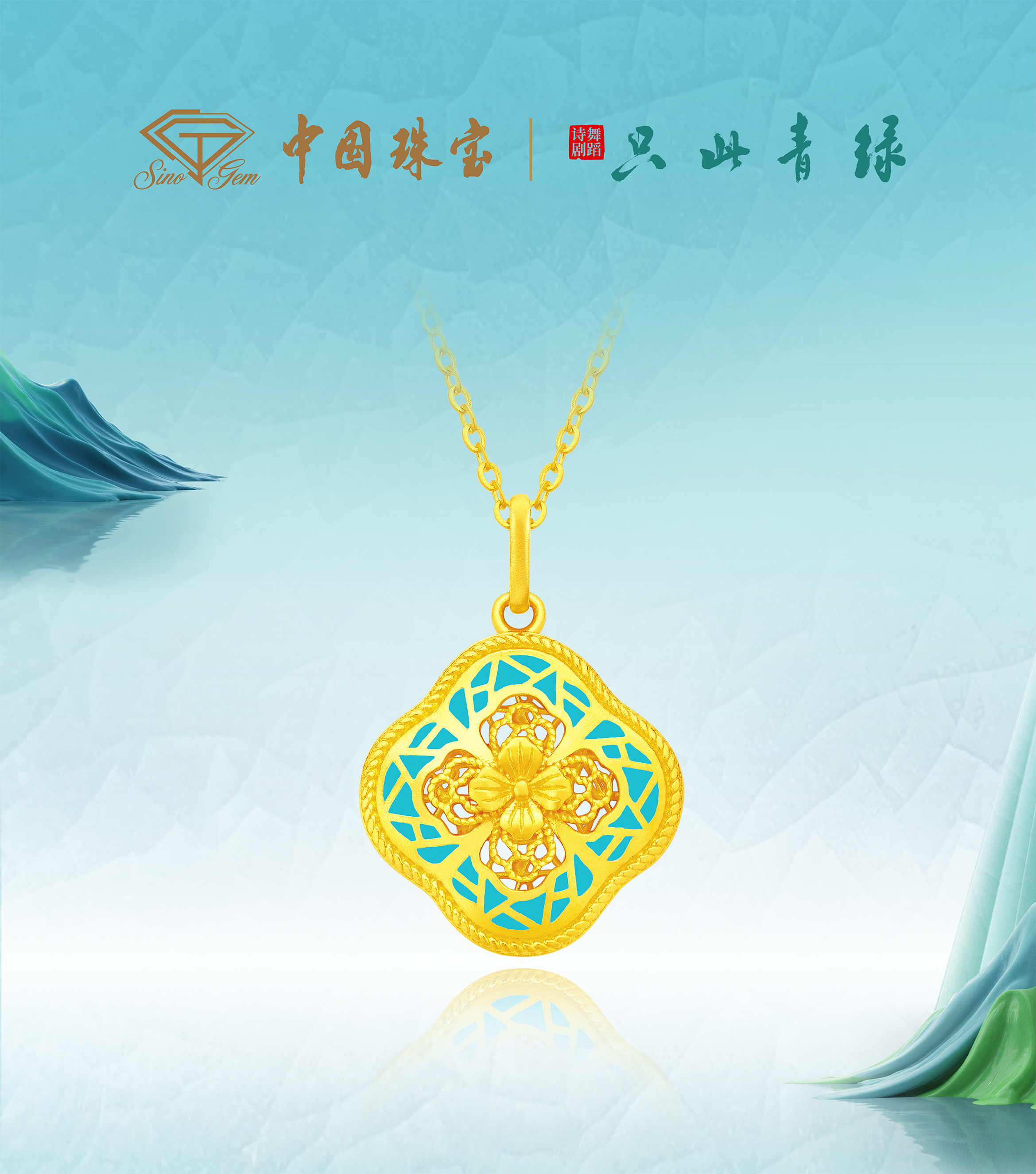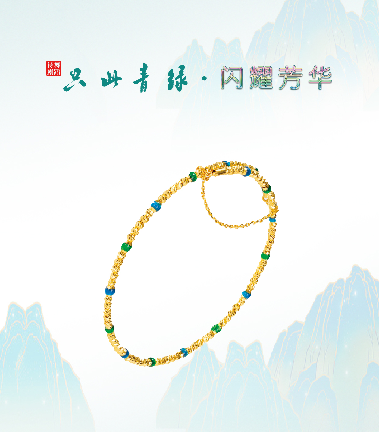 只此青绿·宋韵金系列以《只此青绿》舞蹈诗剧为源,选取汝窑色天青、粉青,精选冰裂纹、宋锦、宋花等辅助元素,将璀璨的宋代美学风格与精湛的现代金饰工艺结合,以典雅气韵,装点新中式穿搭体验,诠释了东方文化中的知性阔达与含蓄睿智之美,彰显中华美学之意蕴。本季青绿·宋韵金系列产品设计选取宋代汝瓷中最被广泛使用的天青色与宋代女性妆面浅朱微红之色为主色系,并精选宋代文化中具有鲜明特点的宋瓷、四合如意、马面裙和繁花作为核心设计元素进行创意融合,通过古法、5G、CNC、珐琅等先进工艺打造,不炫不燥,意蕴深远,彰显东方女性独有的知性阔达,以东方审美“语言”诠释现代时尚金饰之美。