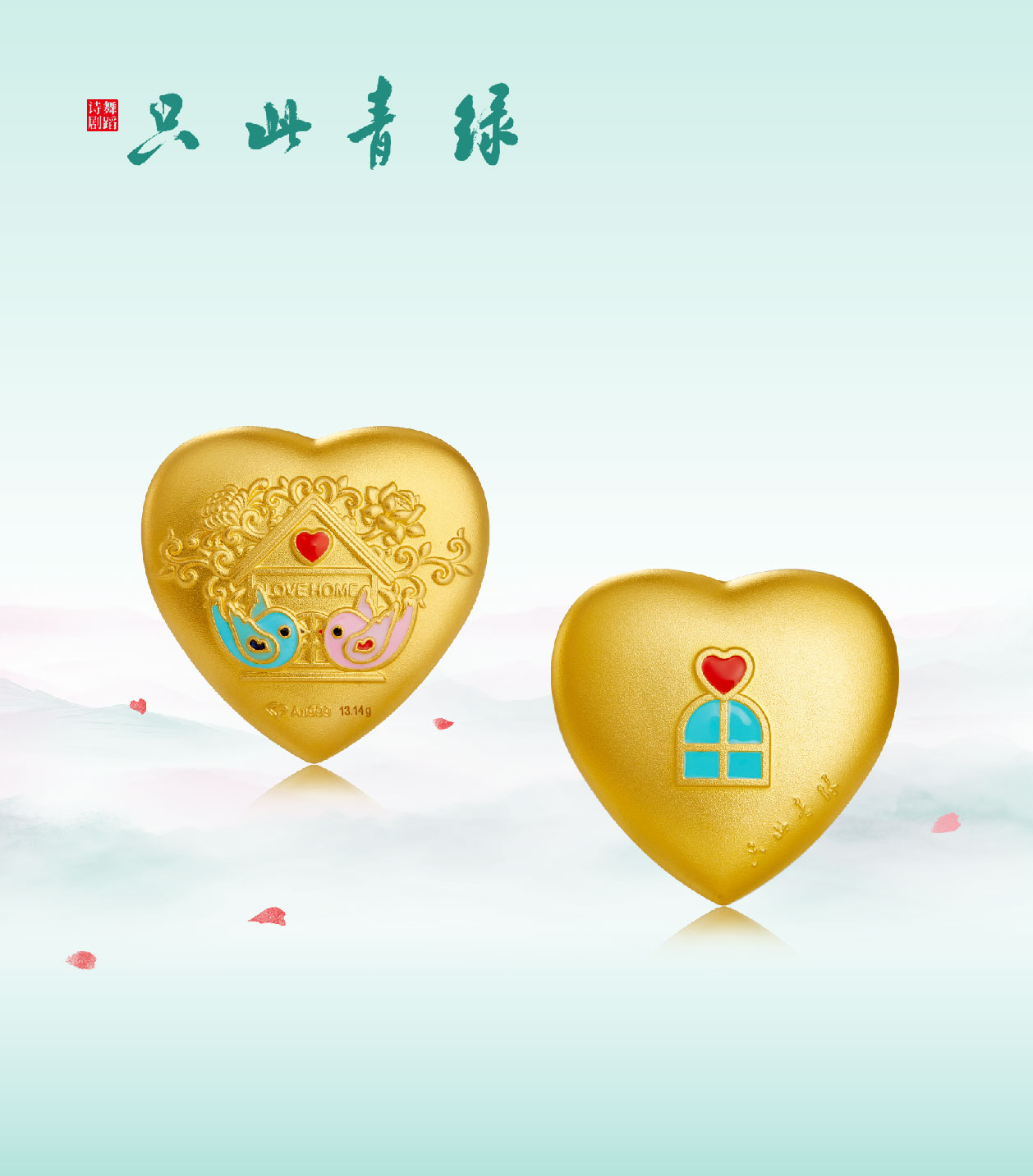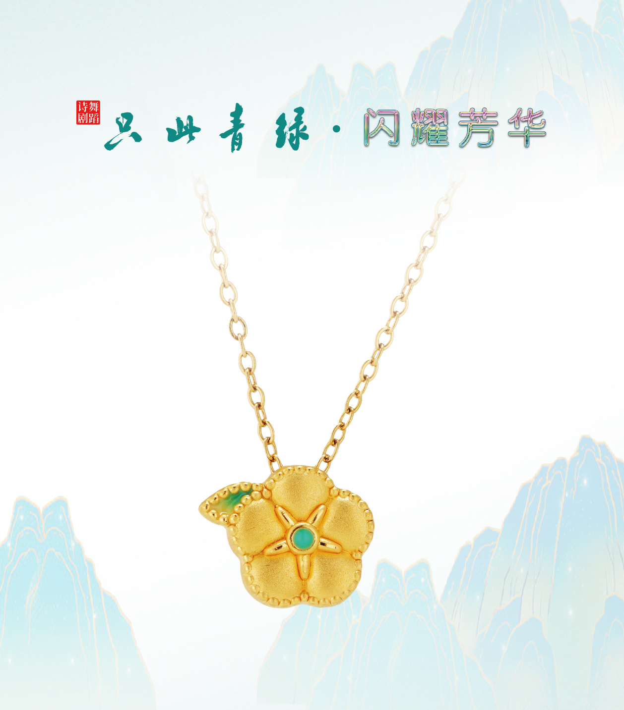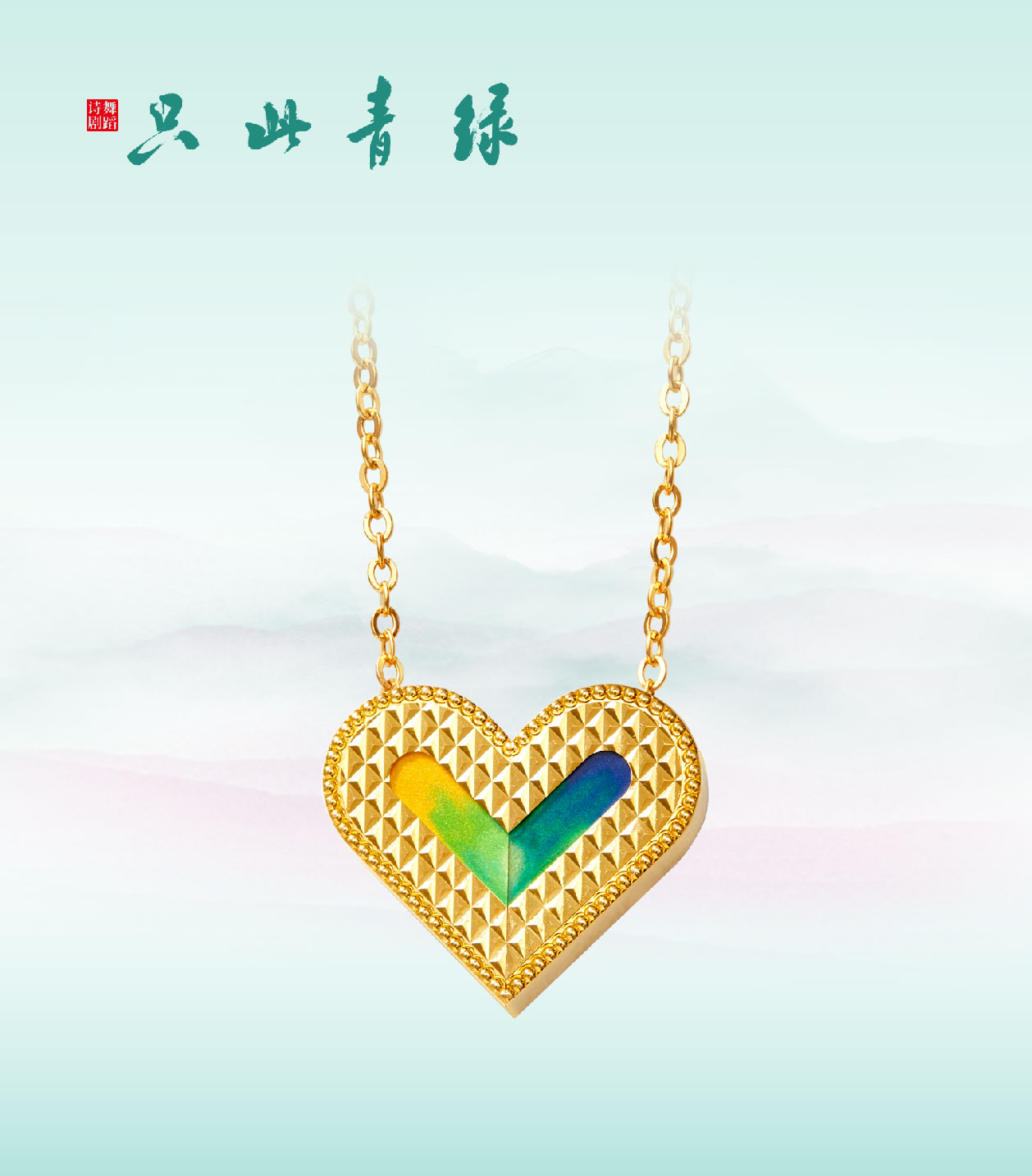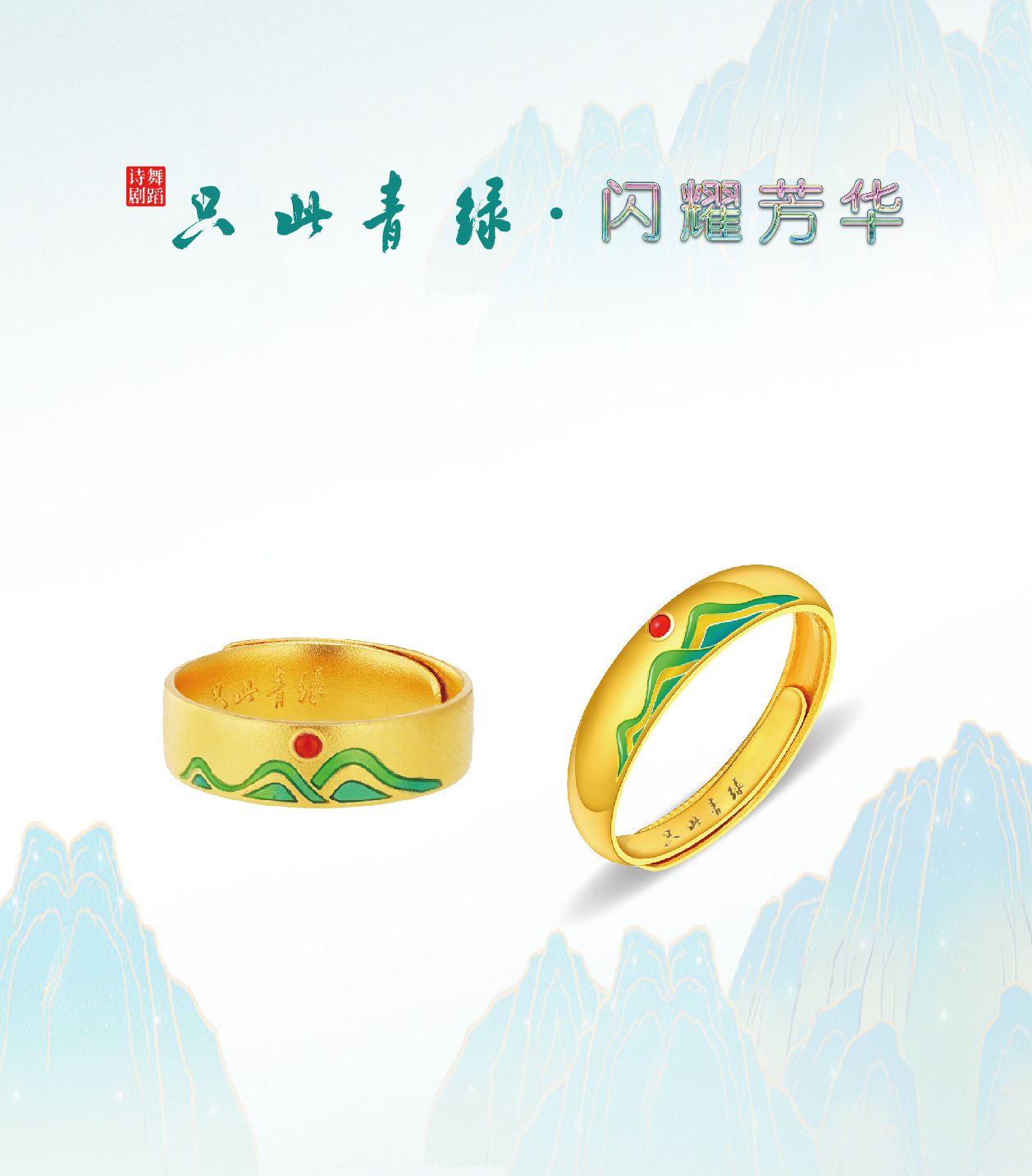 只此青绿·宋韵金系列以《只此青绿》舞蹈诗剧为源,选取汝窑色天青、粉青,精选冰裂纹、宋锦、宋花等辅助元素,将璀璨的宋代美学风格与精湛的现代金饰工艺结合,以典雅气韵,装点新中式穿搭体验,诠释了东方文化中的知性阔达与含蓄睿智之美,彰显中华美学之意蕴。本季青绿·宋韵金系列产品设计选取宋代汝瓷中最被广泛使用的天青色与宋代女性妆面浅朱微红之色为主色系,并精选宋代文化中具有鲜明特点的宋瓷、四合如意、马面裙和繁花作为核心设计元素进行创意融合,通过古法、5G、CNC、珐琅等先进工艺打造,不炫不燥,意蕴深远,彰显东方女性独有的知性阔达,以东方审美“语言”诠释现代时尚金饰之美。